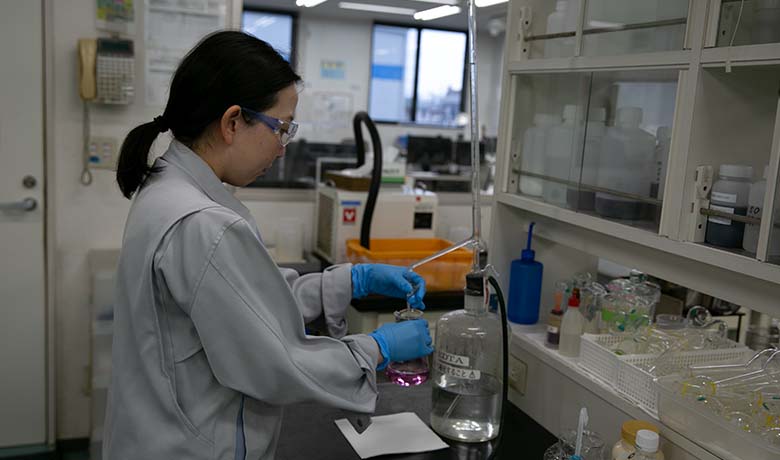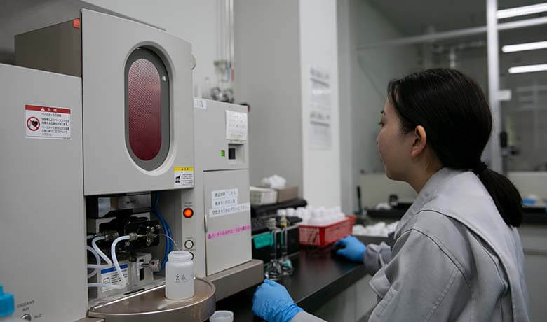 私は中途採用して頂きました。前職で行ってきたことは特定物の品質調査で、その業務を通して自社商品調査の大切さや品質を守る必要性を学びました。そして現在、製品やその他のものを主に分析機器類を使用して測定しています。臨機応変に、優先順位を考えてよりよく業務を行えるように意識して仕事をするように心がけています。